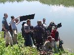 Рибарска лодка отвежда екипа до яхтата където ще се снима поредния кадър. Хънтър Тайло е права в дясно