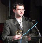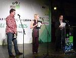Водещите Димитър Павлов и гергана Стоянова изслушват Анди, уебмастера на "Национален Хари Потър фенклуб Потър Мания", който получи награда на публиката в категория "Общности