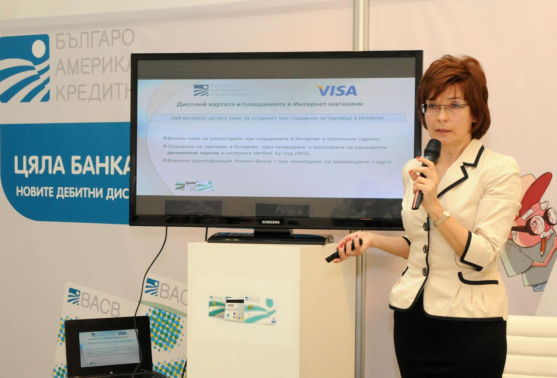 Българо-американска кредитна банка (БАКБ) и VISA Европа представиха един от най-иновативните банкови продукти в света. Във всяка банкова карта V PAY и Visa Business CodeSure има вграден компютър с клавиатура, екран и батерия, благодарение на които тя може да генерира еднократно валидни пароли. Това представлява изключителна новост за българския банков пазар и ще предизвика интереса на всички, които ценят сигурността при боравене със средствата си. Дебитните дисплей карти Visa CodeSure на БАКБ предоставят на клиентите мултифункционалност, съчетавайки в едно устройство международна дебитна карта и токън (генератор на еднократно валидни пароли). Генерираните от токъна пароли се ползват за сигурен вход и онлайн банкиране във виртуалната банка BACB Plus.