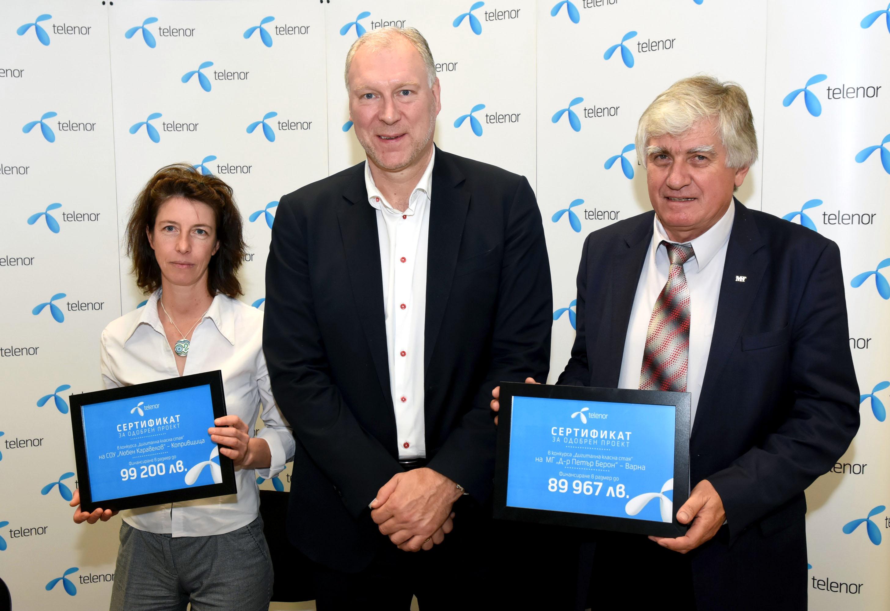 Теленор ще предостави близо 190 000 лева на победителите в конкурса „Дигитална класна стая“. Със средствата ще бъдат финансирани проектите за модернизация на СОУ „Любен Каравелов“ в Копривщица и Математическа гимназия „Д-р Петър Берон“ във Варна. Новината обяви на официална церемония днес главния изпълнителен директор на Теленор Стайн-Ерик Велан. В събитието участваха и директорите на двете училища Бойка Дюлгярова и Павлин Петков.