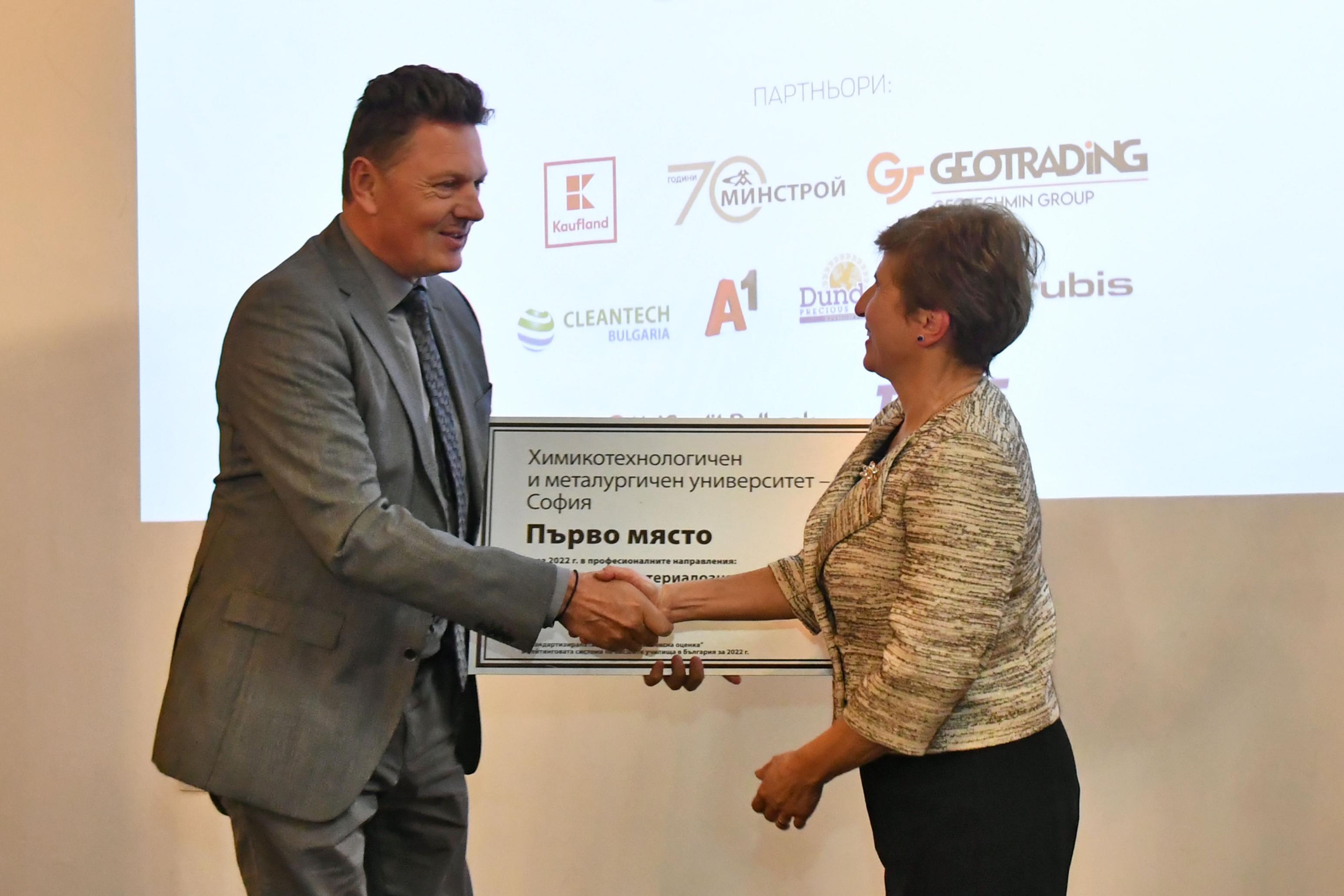 Той поднесе отличието на проф. д-р Сеня Терзиева, ректор на „Химикотехнологичен и металургичен университет“ - София, заел първо място в професионални направления Металургия, Материали и Химични технологии според рейтинговата система на висшите училища у нас. „За мен е чест да връча този приз днес на университета, с който си партнираме успешно от години“, заяви още Тим Курт в речта си.