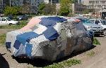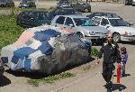 Притежател на автомобил в Бургас съобрази покривалото за возилото си с условията на Световната финансова криза. Платнището е съставено от десетки малки парчета плат, съшити едно към друго, при това в различни цветове. 13.07.2010