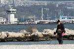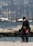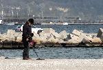 Мъж с металотърсач търси загубени от летовниците ценни предмети  и бижута, като се надява вчерашното вълнение да е изхвърлило нещо ценно на пясъка до брега. Най-често обаче скъпият уред писка на капачки от бира или ламаринки от безалкохолни напитки. 10.11.2010 |