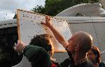 автор: Евгени Димитров Скинхед трие плаката на младежа, предназначен да успокои тълпата, която иска да линчува екипа на ТВ-7 |