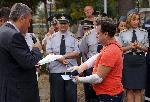 Пожарникарите, които пострадаха при потушаване на огъня на горящите цистерни край село Езерово на 14 август, днес дойдоха в Пожарната да получат награди за службата и героизма си.  Със заповед на Главна дирекция “Пожарна безопасност и защита на населението” с грамоти за проявен героизъм бяха отличени Красен Костов, Иван Недев, Димитър Димитров от пожарната служба в Девня, както и пожарникарите от Варна Георги Георгиев, Венелин Стоянов, Никола Колев и Трифон Трифонов. Самите пострадали пожарникари, заявиха, че не биха се отказали от професията си. От името на Синдикалната федерация на служителите на МВР с грамоти и почетни знаци бяха наградени всички 11 пожарникари, участвали в овладяването на ситуацията в петролната база. На събитието дойде и министърът на Регионалното развитие Десислава Терзиева. 10.09.2013 |