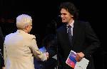 Една от легендите на родното кино - сценаристът и писател Христо Ганев получи Специалната награда на София за цялостно творчество и изключителни постижения в областта на културата.  Призът бе връчен на 89-годишния творец от кмета на столицата Йорданка Фандъкова на церемония в Народния театър, където бе отпразнуван Денят на София. Христо Ганев, който е известен като един от бунтарите в българското кино, работи в тандем с вече покойната си съпруга режисьорката Бинка Желязкова. Двамата създават филмите "А бяхме млади", "Животът си тече тихо", "Голямото нощно къпане", "Басейнът", "Нощем по покривите" - някои от тях свалени от екран по идеологически причини преди 1989 г. Последните засега продукции по негов сценарий са анимационните "Сламеният човек" и "Парцалът", както и игралният филм "Цахес". „София, със своята хилядолетна история, отдавна е извоювала място на културната карта на Европа, но най- ценният ресурс и богатство на града са хората, защото хората правят града какъвто е", каза Фандъкова преди да връчи голямата награда. Тя благодари на всички творци, представители на всичките сфери в областта на културата и изкуството и представители на бизнеса, на медиите и на спорта - на всички, които през последните години работеха и подкрепяха кандидатурата на София, за Европейска столица на културата през 2019 г. „Благодаря на моите колеги кметове и на жителите на Благоевград, Кюстендил, Перник, които се включиха в това огромно състезание и подкрепиха кандидатурата на София и Югозападен регион за европейска столица на културата- 2019 г.", добави Фандъкова. Тя посочи, че за нея е голяма чест да връчи Специалната награда на Столична община за особен принос в сферата на културата и изкуството на Христо Ганев. Акад. Пламен Карталов получи награда за особени постижения в музиката заради четирилогията на Вагнер "Пръстенът на Нибелунга", поставена от него в Софийската опера - за пръв път в историята на оперното изкуство в България. Филмът "Последната линейка на София" на Илиян Метев бе отличен за постижения в киното, а Камен Донев си тръгна с приза за театър. "Денят започва с култура" на БНТ е лауреатът за журналистика, а архитект Васил Китов, ръководител и автор на проектите за реставрацията на храма "Света София" и Археологическия музей в неговото подземие получи статуетка за постижения в областта на архитектурата. Известният преводач от немски Венцеслав Константинов е тазгодишният лауреат на общинския приз за литература със своята антология "Великите немски поети XII-XX век". 18.09.2013 |