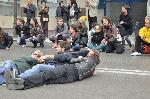 И тази сутрин протестиращите студенти от НАТФИЗ бяха подготвили улично представление на затворената ул. “Раковски”. То бе под надслов “Да будиш или не?” и започна с флашмоб, който пресичаше пешеходната пътека пред академията. Уличният пърформанс е своеобразен поздрав към минувачите по повод Деня на народните будители.
