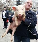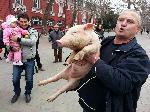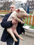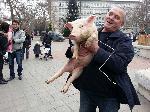 автор: Любомир Бенковски - Бенджи Росен Марков показва на минувачите помилваното прасе Пурко |