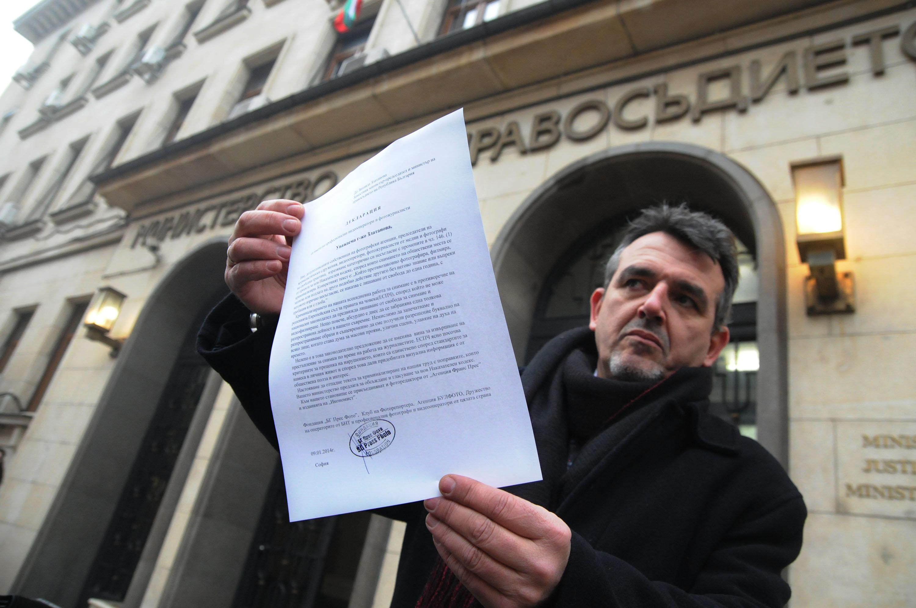 Група фоторепортери внесе в Министерството на правосъдието декларация срещу готвените промени в член 146 (1) от проекта на нов Наказателен кодекс. Фотографите се срещнаха с министър Зинаида Златанова и изразиха опасенията си, че спорните разпоредби ще блокират работата им.