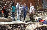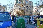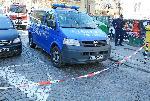 Движението по тясната улица е ограничено от коли на полицията и пожарната. Достъпът до двора, където е мястото на престъплението е напълно блокиран.