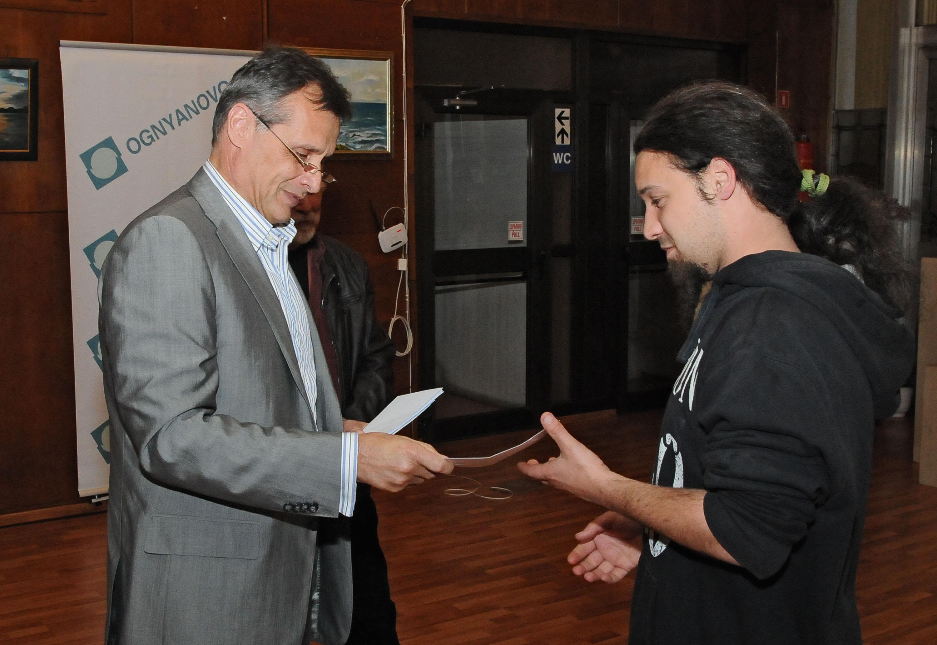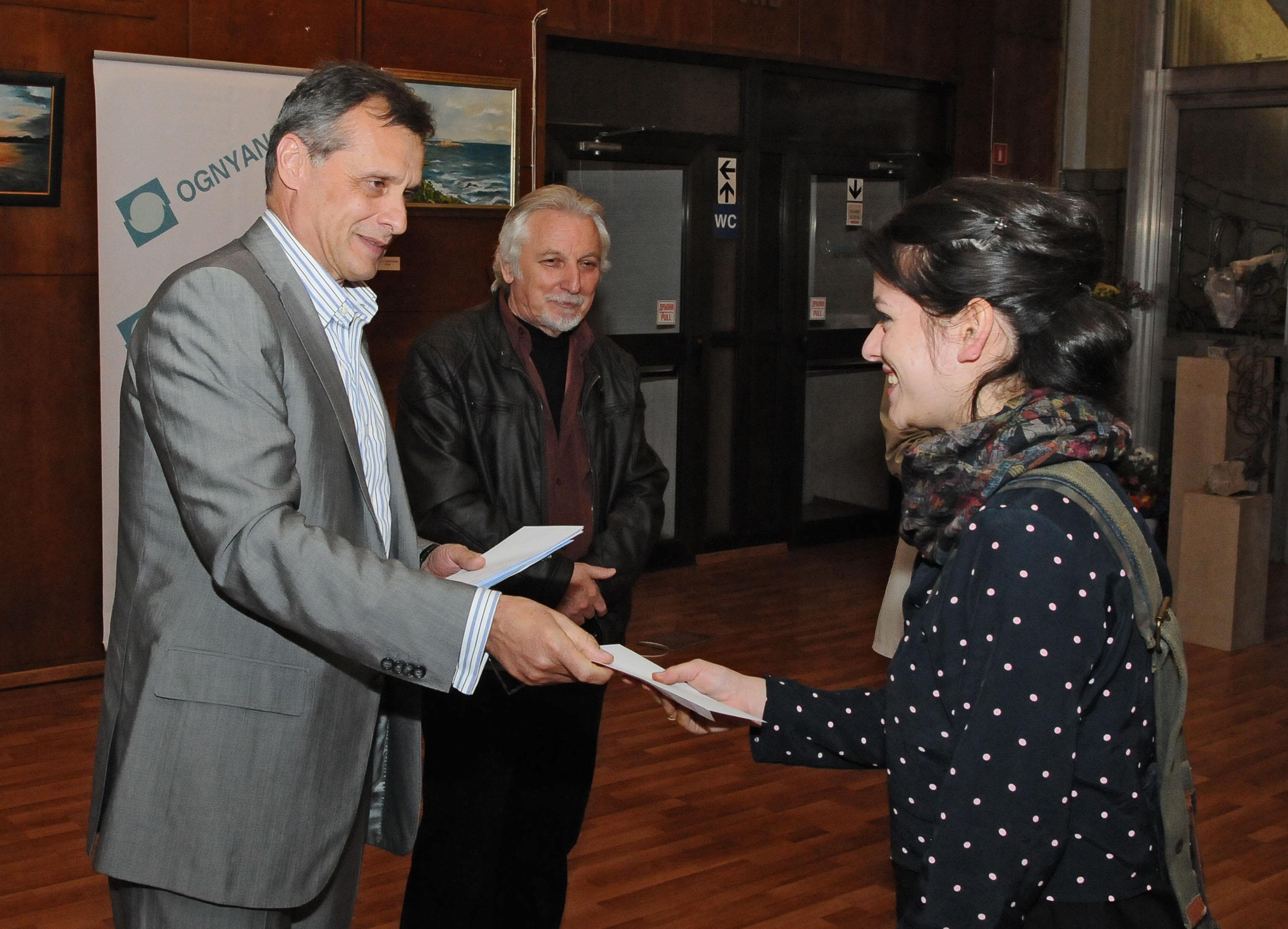 Доктор Николай Колев, изпълнителен директор на “Огняново К” АД, награди победителите в деветия годишен конкурс за малка пластика от камък и метал, дърво или друг траен материал в изложбената зала на архитектите снощи. Двадесет студенти от специалностите „Метал”, „Резба” и „Скулптура” от Националната художествена академия отново показаха високо ниво на професионализъм и силно изразен вкус и усет за материал и естетика. Конкурсът се провежда в две категории – камерни скулптурни творби и творби от областта на медалиерството.