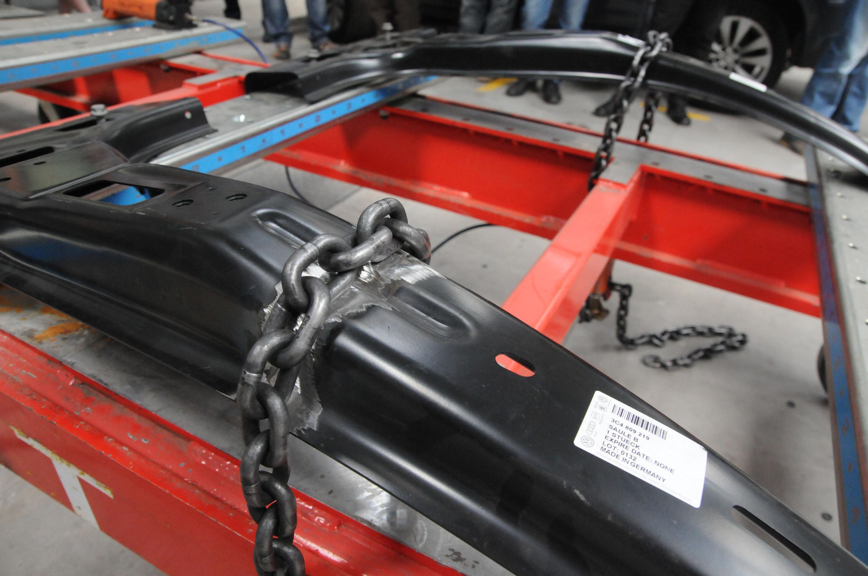 Чрез конкретния експеримент краш тестове и сравнителни тестове в резултат на тежки странични удари върху превозно средство според стандартите на EuroNCAP се коментираха указанията на производителя за ремонт като смяна на цялата В-колона, смяна на детайли от високо-якостна стомана, използване само на оригинални резервни части, шлайфане на точковите заварки, защитно покритие на долната страна с боя (врати, калник, страница купе), монтаж и регулиране на вратите и предаване на автомобила в перфектен външен вид. Резултатът от извършения каросериен ремонт е, че при деформация на страницата на автомобила се постига активиране на въздушните възглавници, както и че здравата B-колона се деформира в областта на свързване с прага. Така се гарантира здравината на купето и безопасността на пасажерите.