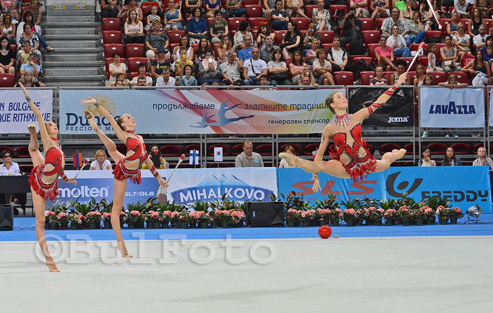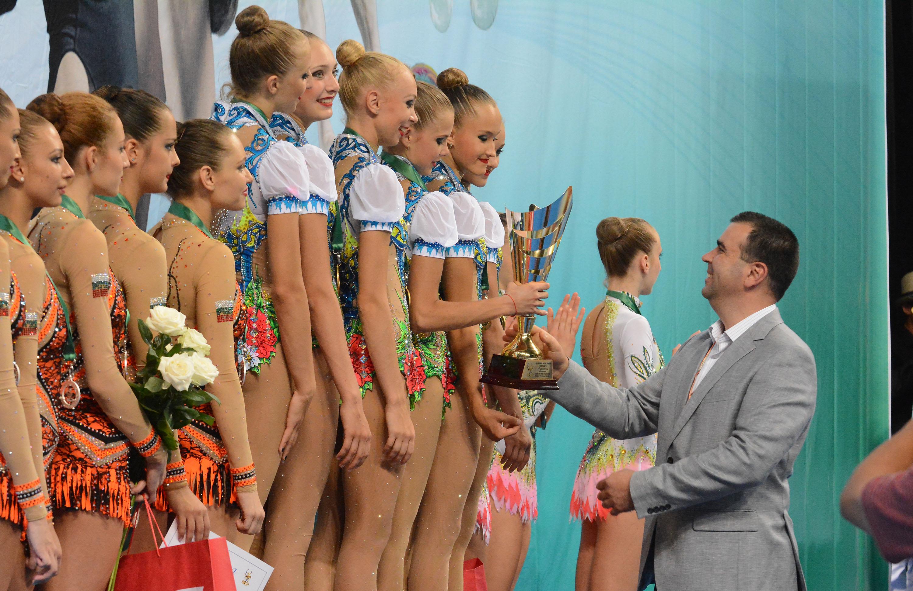Националният ни отбор по художествена гимнастика, воден от Ина Ананиева, се поздрави със сребърен медал от Световната купа Dundee World Cup, която се провежда в зала Арена Армеец в София. Шампион стана Русия с 35.800 точки, а трети се наредиха италианките с 34.800. Родните състезателки се класираха и за двата финала на отделните уреди, които предстоят днес. 10.08.2014
