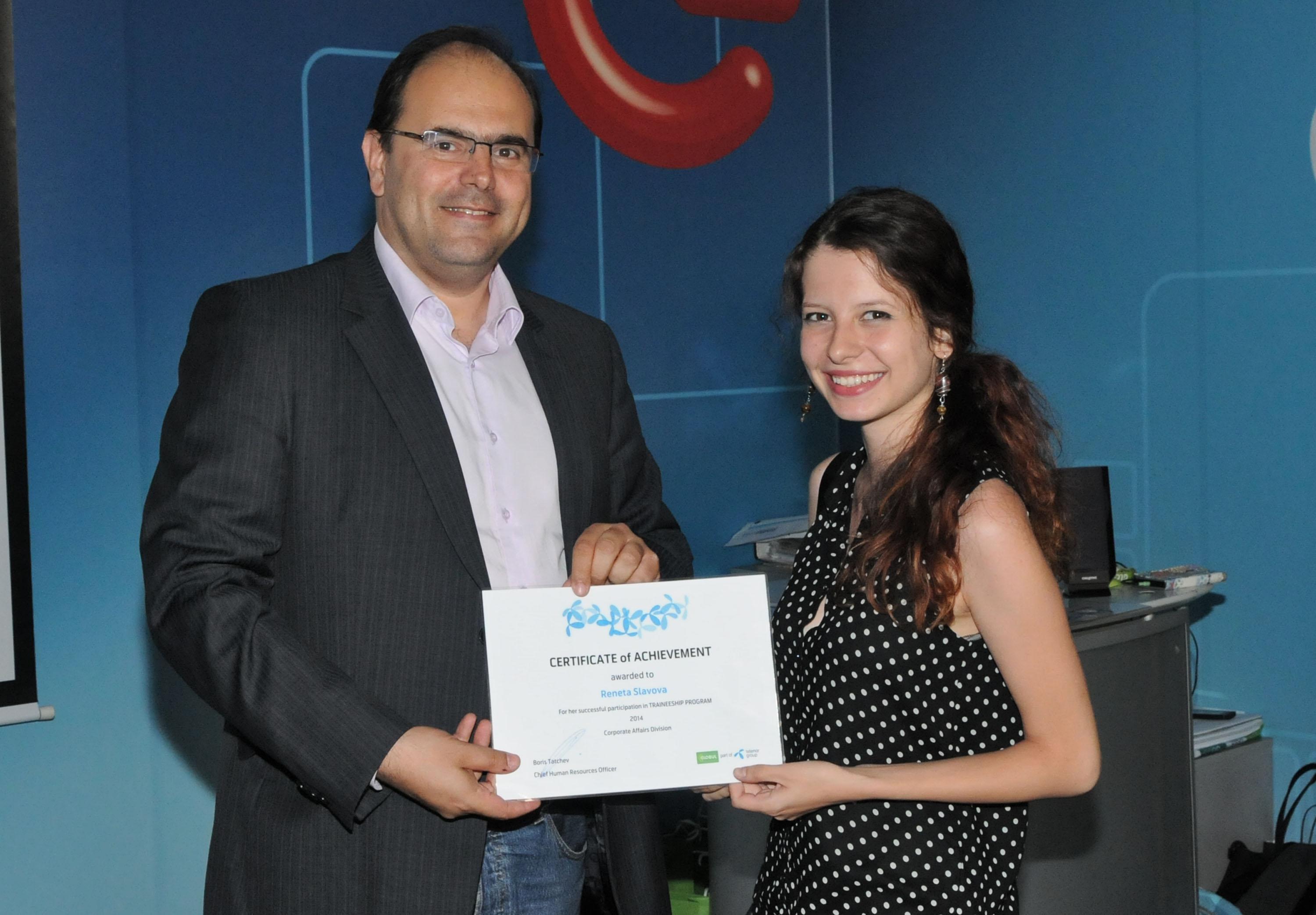 автор: Стефан Марков Ренета Славова, стажант в GLOBUL получи сертификат за успешно завършване на програмата от Ясен Гуев, главен директор „Корпоративна политика“ в компанията. |
