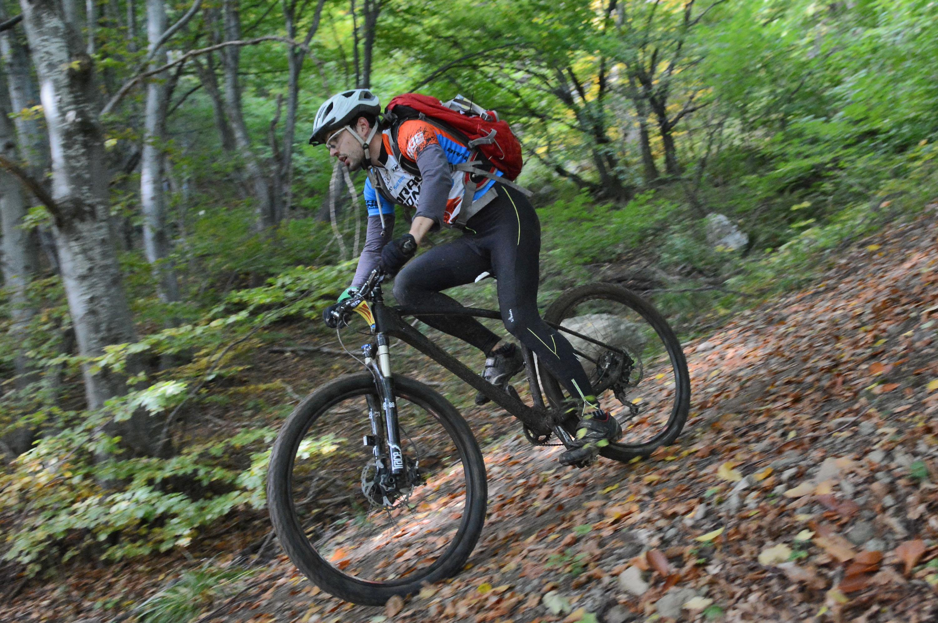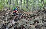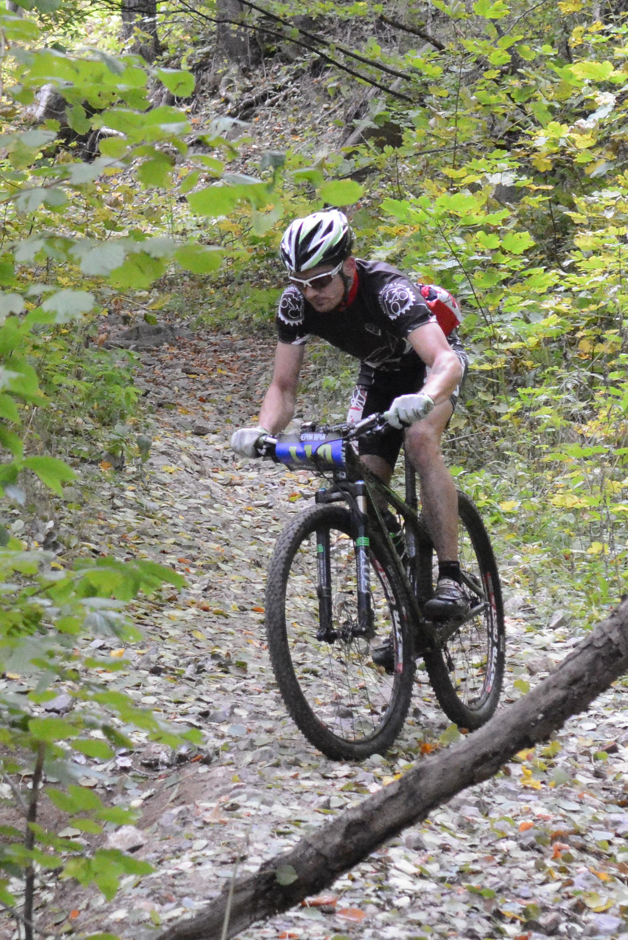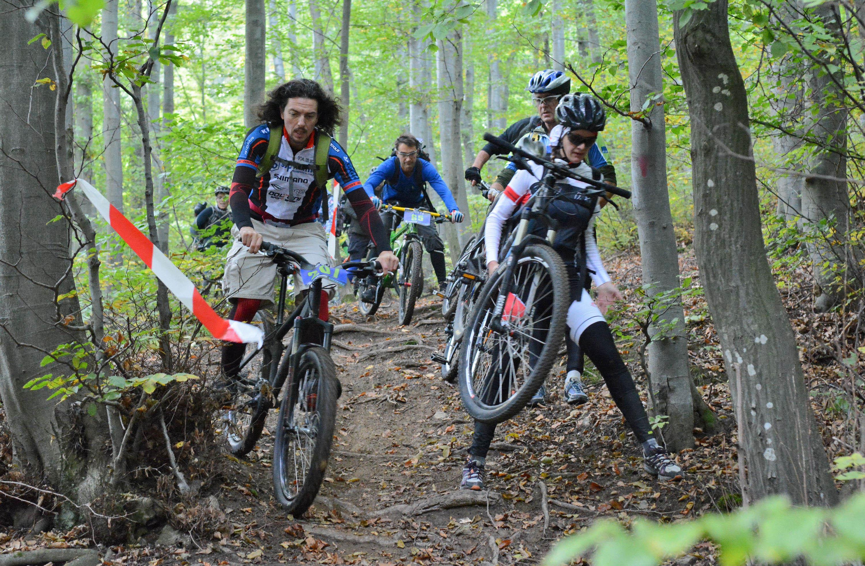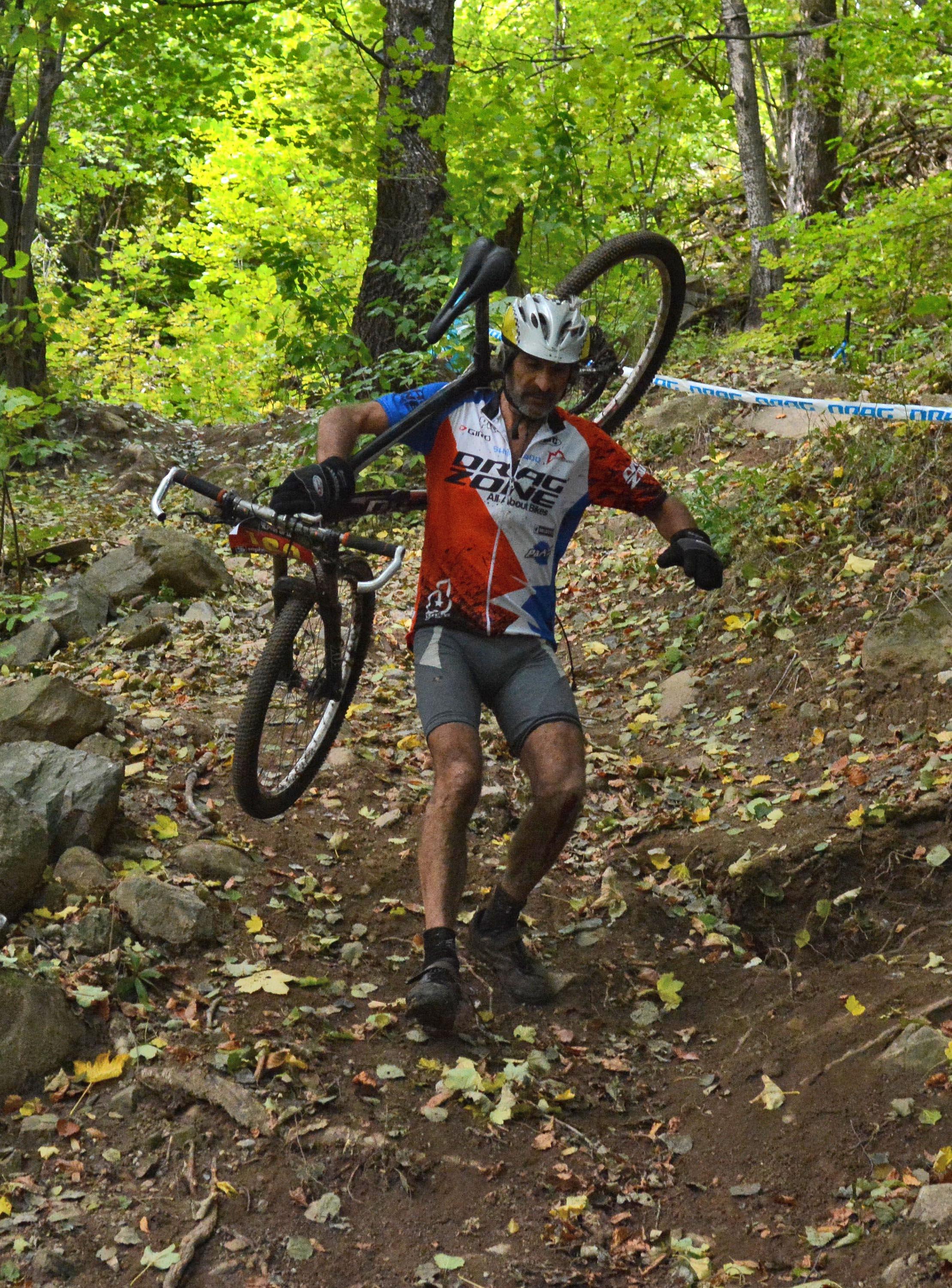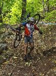 автор: Евгени Димитров Състезател носи на гръб велосипеда си през трудно трасе