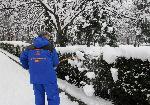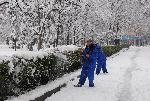 Работници от Озеленяване свалят тежкия сняг от храстите