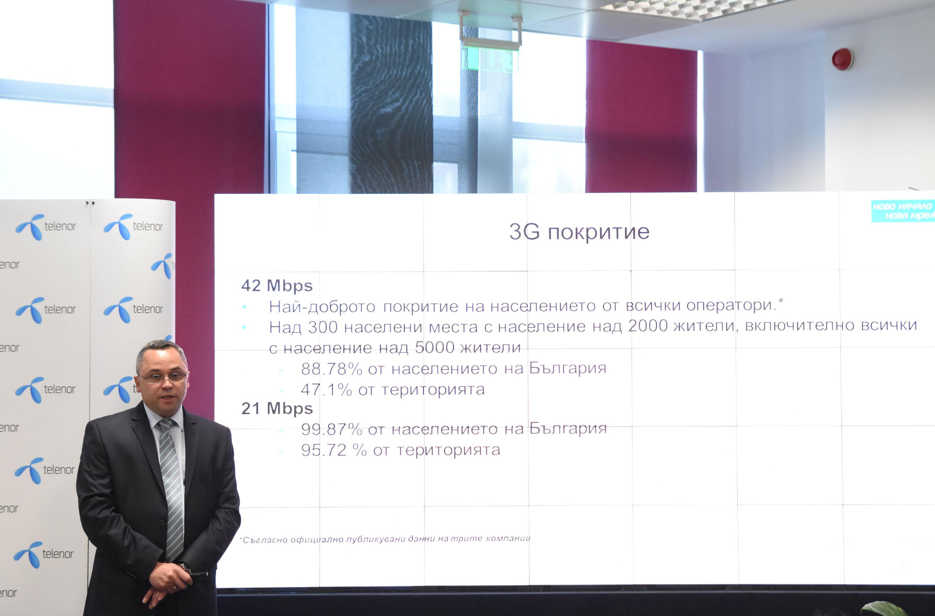 Теленор приключи предсрочно мащабния проект за обновяване и подобряване на мрежата си и сега разполага с инфраструктура за предлагане на услуги от четвърто поколение. Новата 3G мрежа на Теленор позволява по-високи скорости за пренос на данни, по-голям капацитет и съществено подобрено потребителско преживяване, заяви на пресконференция в столицата главният изпълнителен директор на компанията г-н Стайн-Ерик Велан. Проектът е част от дългосрочните инвестиционни планове на Теленор за България и е част от стратегията на компанията да предлага най-добрите услуги за мобилен интернет в страната. Мрежата на Теленор вече предлага максимално достижима скорост от 42 Mbps чрез технологията HSPA+ на клиентите си във всички населени места с население над 5000 жители и скорости до 21 Mbps в повечето останали райони. Към момента мрежата на Теленор, която позволява скорост до 42 Mbps покрива приблизително 89% от населението на България в повече от 300 населени места и около 47% от територията на страната, което е най-доброто покритие на населението сред всички мобилни оператори, според официално публикуваните данни на компаниите. Мрежата на компанията със скорост на пренос на данни до 21 Mbps е достъпна на 96% от територията на страната и за 99.87% от населението. За да отбележи успешното приключване на проекта, Теленор предлага на клиентите на абонаментните си планове да изпробват възможностите на новата мрежа като им подарява еднократен пакет от 500 MB на максимална скорост, валиден за период от 30 дни. Всеки желаещ да изпробва новата мрежа на Теленор може да активира пакета като изпрати безплатен SMS с текст START на кратък номер 500 или да го направи чрез услугата MyMenu като набере *123# от своя мобилен апарат. “Теленор вече притежава мрежата, която ще позволи на компанията да продължи да развива иновативни телекомуникационни решения, включително и LTE-базирани продукти и услуги, което допълнително ще подсили конкурентната ни позиция на българския пазар”, коментира г-н Велан. “Очакваме Комисията за регулиране на съобщенията да завърши процеса по разпределение на допълнителния честотен спектър в обхвата 1800 MHz, за да можем да започнем да предлагаме и 4G-услуги”, допълни. “Проектът за обновление на мрежата на Теленор започна през април 2014 г. и включваше пълна подмяна на съществуващата 2G и 3G мрежа на компанията, обновяване и подобряване на достъпа и опорната транспортна мрежа, както и на опорната мрежа на Теленор и свързаните с тях услуги”, заяви главният технически директор на компанията г-н Владимир Радойчич. “Благодарение на отличното планиране и превъзходната координация с партньорите ни Huawei, проектът бе приключен по-рано от предвиденото без никакви сериозни неудобства за потребителите. Новата ни мрежа успешно премина и важен тест по време на тежките снеговалежи през март, когато в много градове и села най-вече в Южна България мрежата на Теленор беше единствената връзка на хората и институциите с останалата част на страната”, допълни той. “Клиентите на Теленор вече се ползват от предимствата на обновената и подобрената ни мрежа, включително от чувствително по-добрите скорости за даунлоуд и ъплоуд в градовете с най-многобройно население. Налице е по-добро усещане от ползването на мобилни приложения. В резултат, потреблението на мобилен интернет от Теленор се е повиши