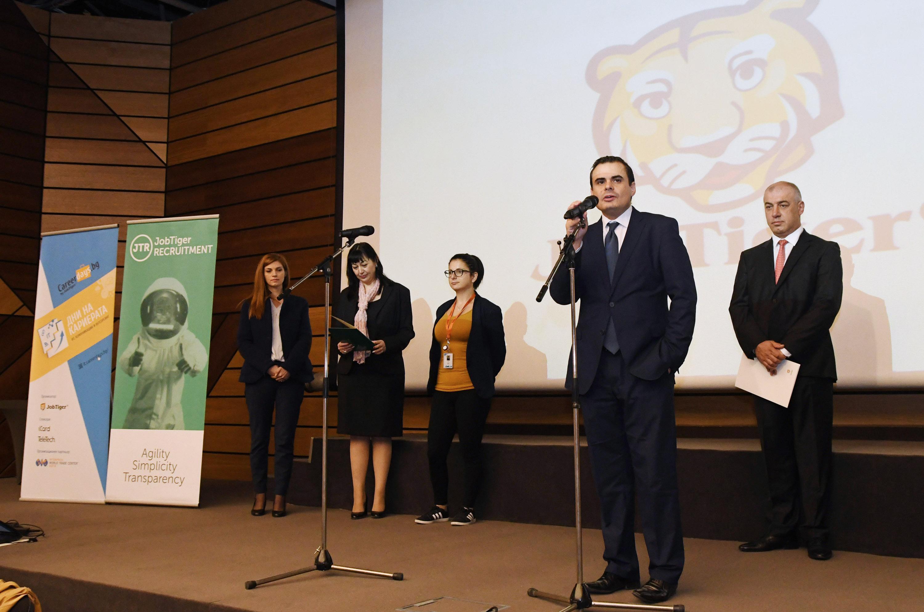 Старт на кариерния форум, в който участваха над 80 фирми, дадоха Светлозар Петров, управител на JobTiger; Петър Николов, заместник-министър на образованието; Полина Маринова, директор на дирекция „Регионална служба по заетостта“ - София, Мая Гиндева, представител на TeleTech Easte Europe - един от спонсорите на събитието, както и Ангелина Славкова, представител на Интерпред - СТЦ София, организационен партньор на кариерния форум. 13.10.2017 |