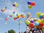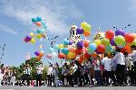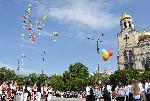 Празничната програма започна на площад "Св. Св. Кирил и Методий“ - пред сградата на катедралния храм "Св. Успение Богородично". Там официално бе издигнат националния ни флаг, а след това над 600 ученици и студенти изпълниха фолклорна композиция. Тя завърши с това, че в небето полетяха цветни балони с буквите от българската азбука и бели гълъби.