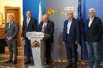 автор: Андрей Велчев / www.luboslovie.bg/ от ляво надясно: изпълнителният директор на Асоциацията на индустриалния капитал в България (АИКБ) Добрин Иванов, председателят на НСТС и вицепремиер Томислав Дончев, министърът на труда и социалната политика Борислав Гуцанов, президентът на КНСБ Пламен Димитров и главният икономист на КТ "Подкрепа" Атанас Кацарчев. |