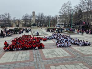 Пижо и Пенда, в бяло и червено, оживяха днес на централния площад във Видин. За поредна година над 500 ученика, облечени в бели и червени тениски направиха "жива мартеница", която е запазена видинска марка. С нея те поздравиха България и целия свят с пожелание за здраве и мир.