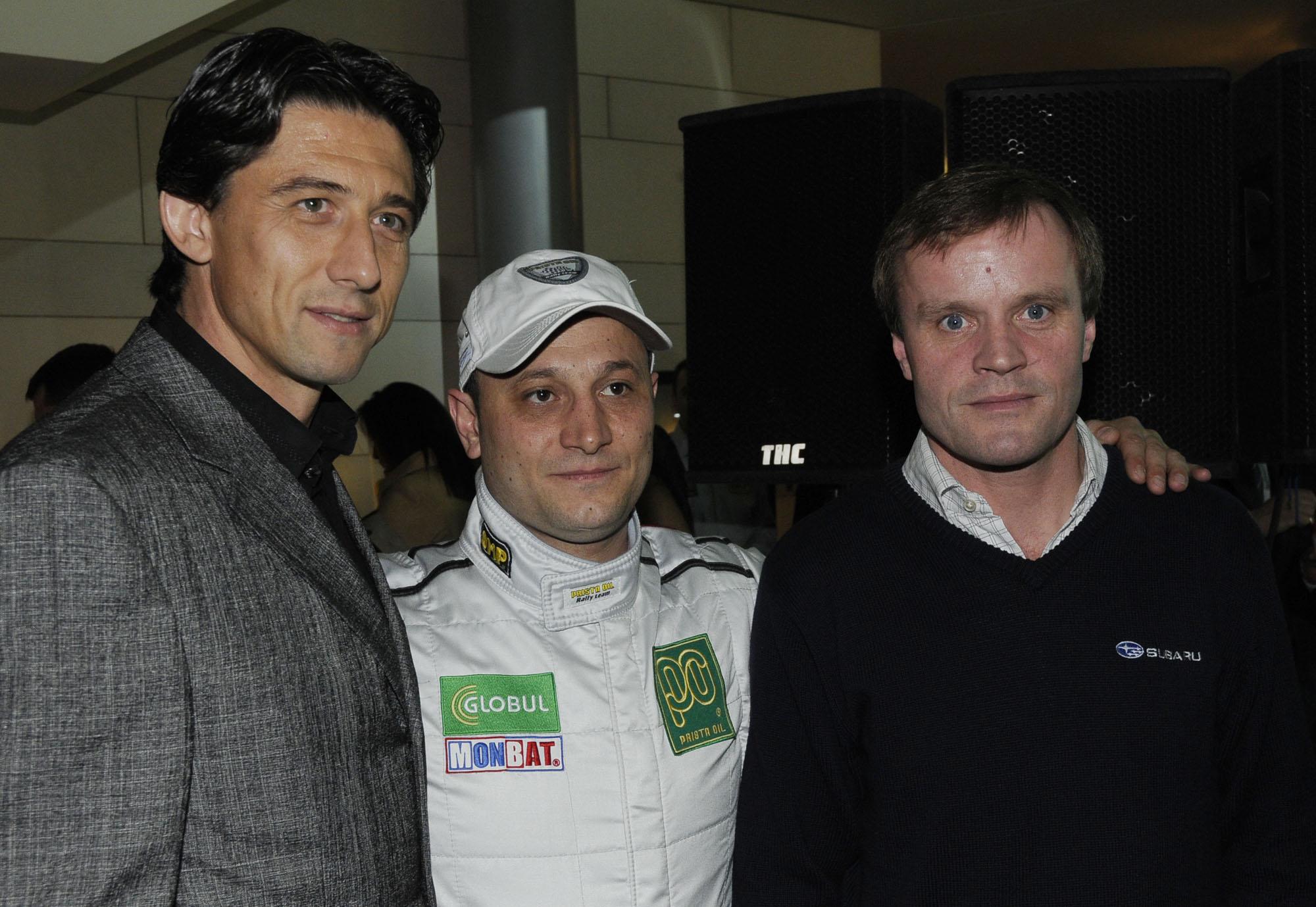 Футболистът Даниел Боримиров, позира за снимка с пилотът Боби Борисов и световният шампион Томи Макинен