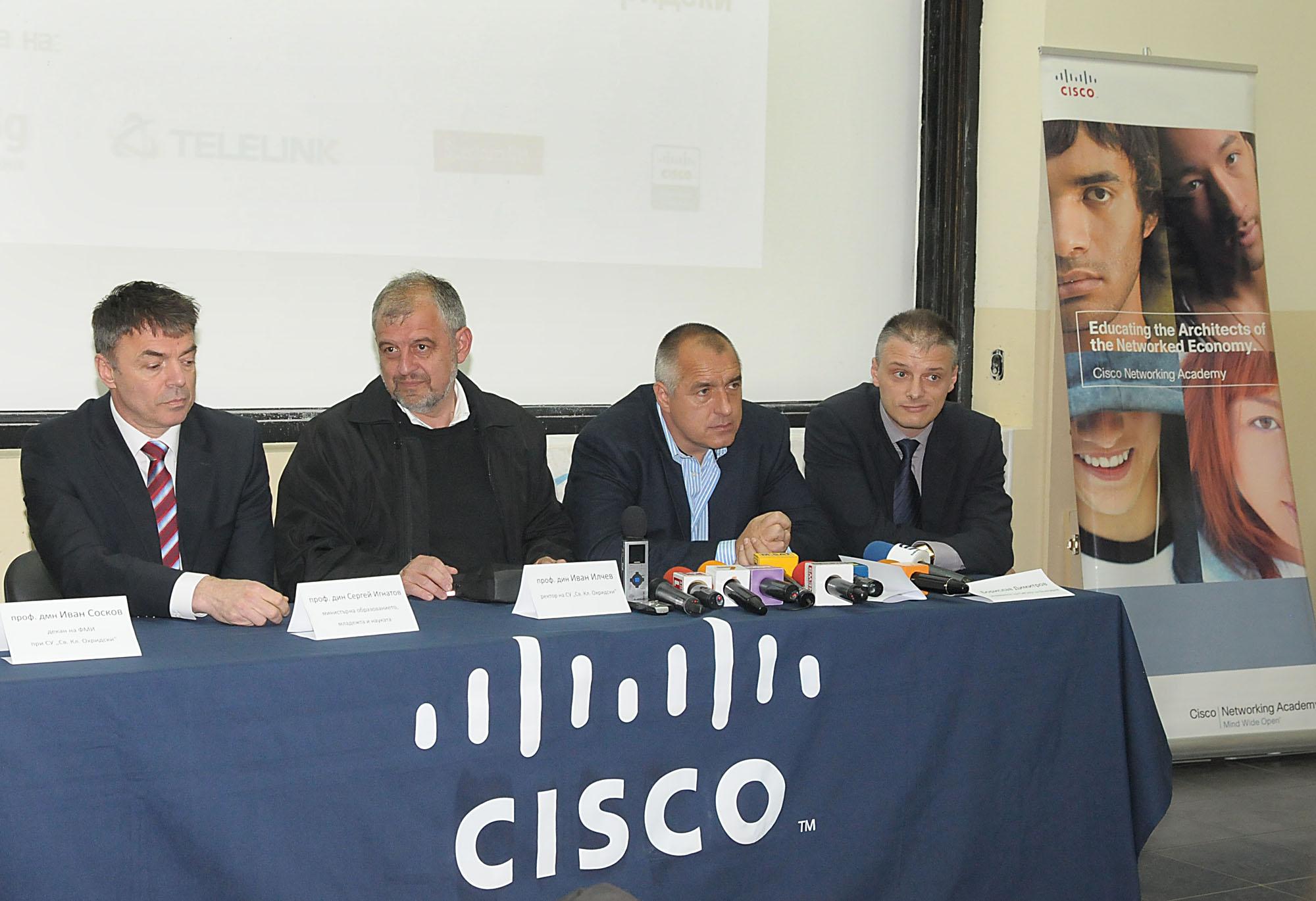 Министърът на образованието, младежта и науката Сергей Игнатов, ректорът на Софийския университет “Св. Климент Охридски” професор Иван Илчев, премиерът Бойко Борисов и Борислав Димитров, управляващ директор за „Сиско” България на откриването