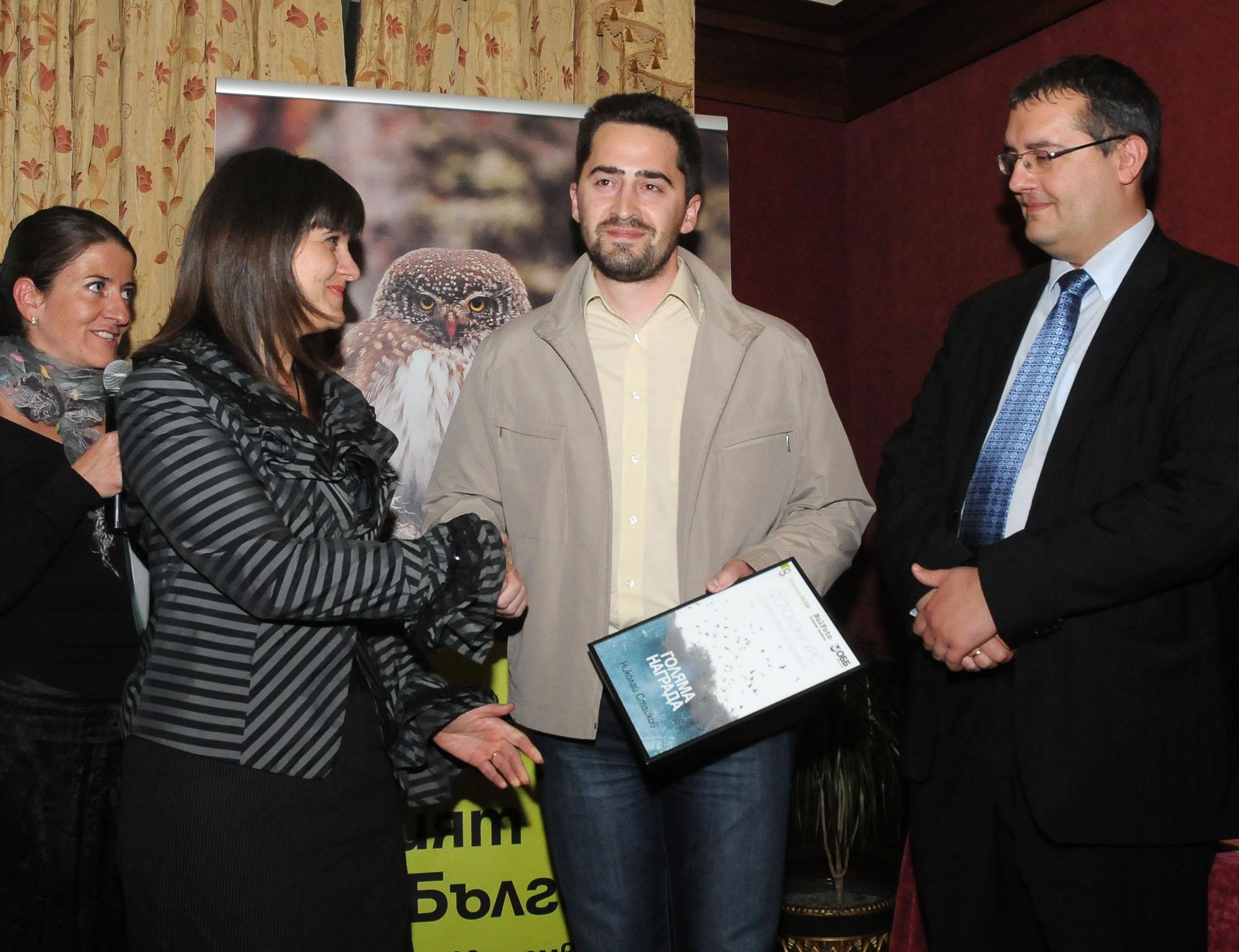размер: 1537X2000 Автор: Миро Златев Главният редактор на "Списание 8" Ганета Сагова връчва Голямата награда на конкурса на Николай Стайков, вдясно е Людмил Каравасилев, мениджър „Връзки с обществеността и спонсорство” в ОББ |