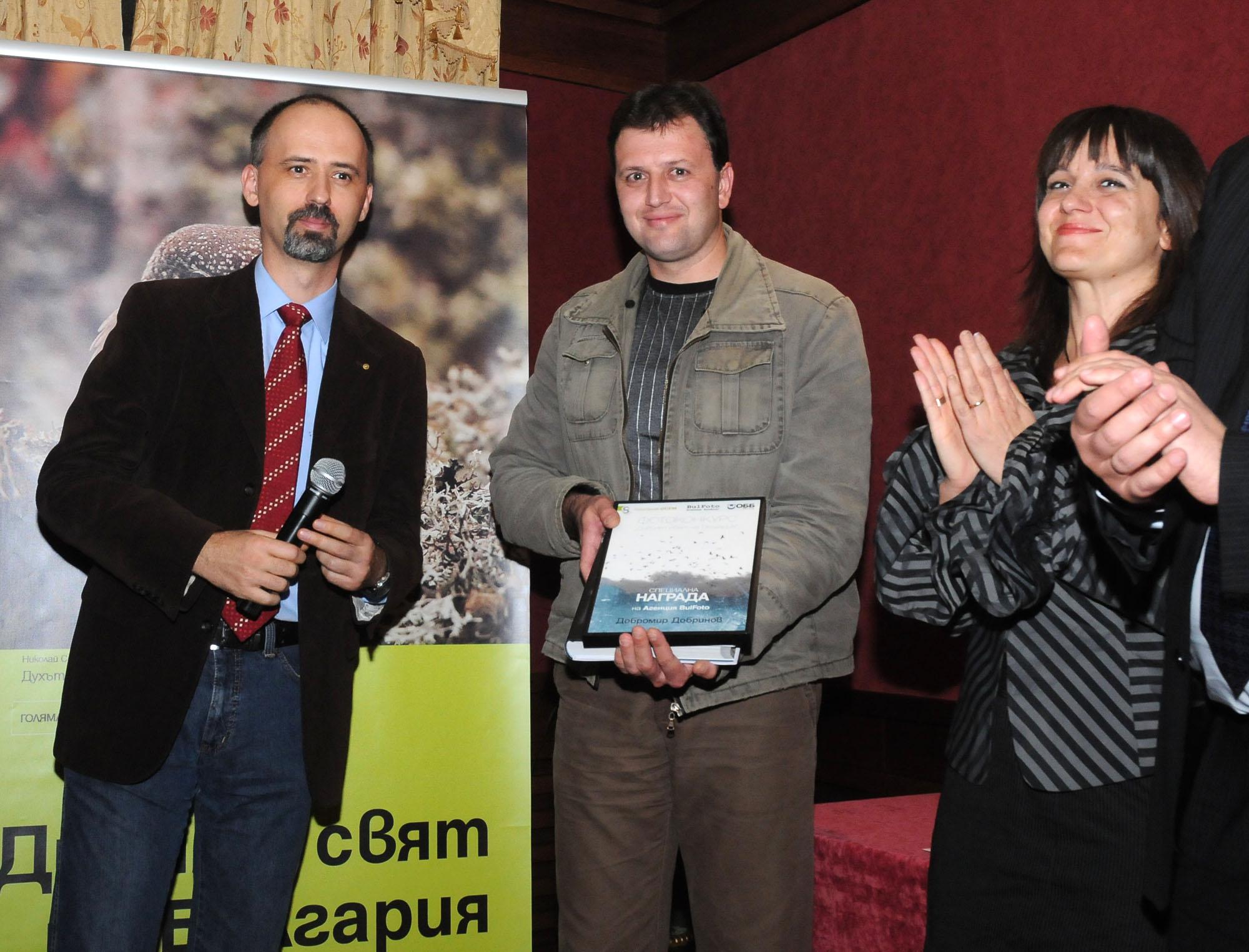 размер: 1525X2000 Автор: Миро Златев Евгени Димитров, управител на Булфото, връчва Наградата на фотографска агенция Булфото на Добромир Добринов, вдясно е Ганета Сагова, главен редактор на Списание 8 |