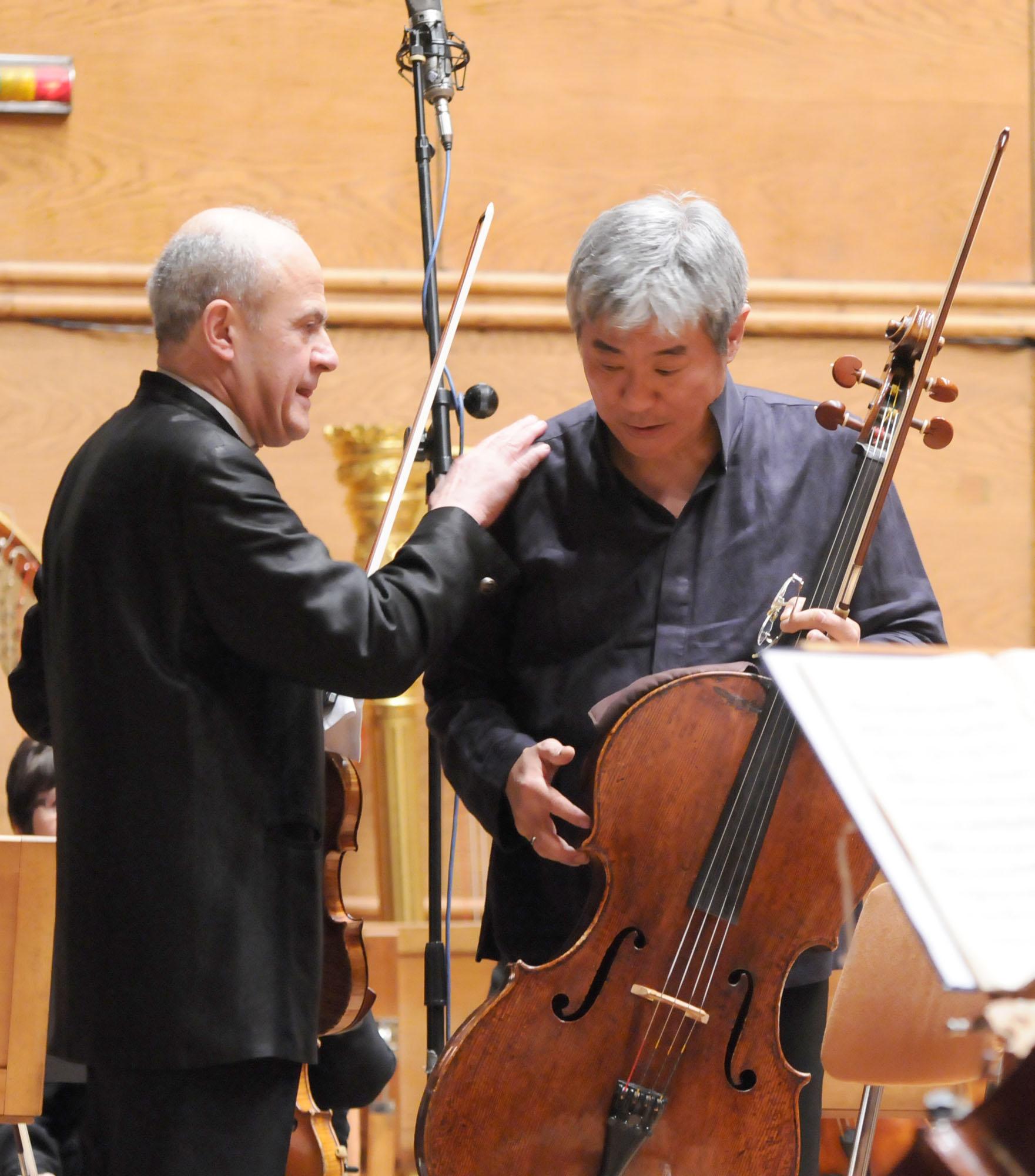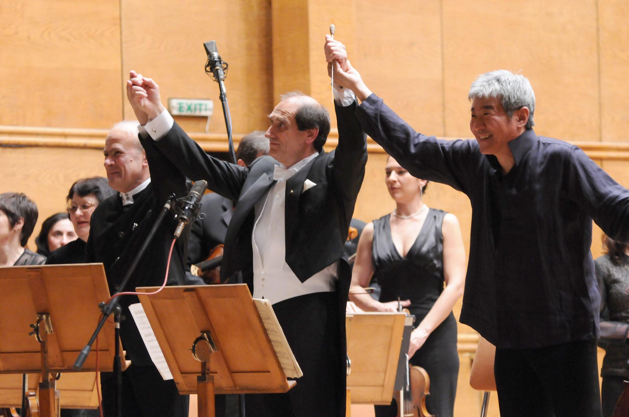 Солистите на Симфоничния оркестър на БНР Минчо Минчев и Янг Чанг Чо и диригентът Емил Табаков